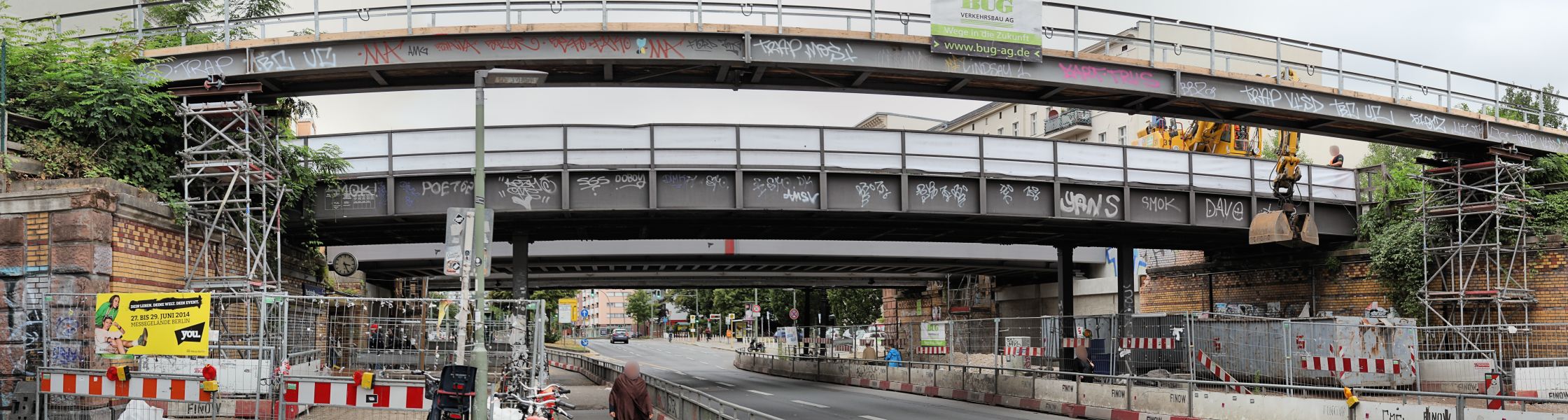 Die Bauarbeiten begannen am Wochenende des 1. Septembers 2013 (Sperrung des Gleises Richtung Potsdam, Einbau einer Weiche im Nordsüd-S-Bahntunnel, eingleisige Betriebsführung in beiden Richtungen auf dem Gleis Richtung Anhalter Bahnhof), am Wochenende des 6. Aprils 2014 wurde die neue Brücke für das Gleis Richtung Potsdam eingebaut und an diesem Wochenende (29. Juni 2014) in Betrieb genommen (Umbau der Weiche im Nordsüd-S-Bahntunnel, eingleisige Betriebsführung in beiden Richtungen auf dem Gleis Richtung Potsdam). |