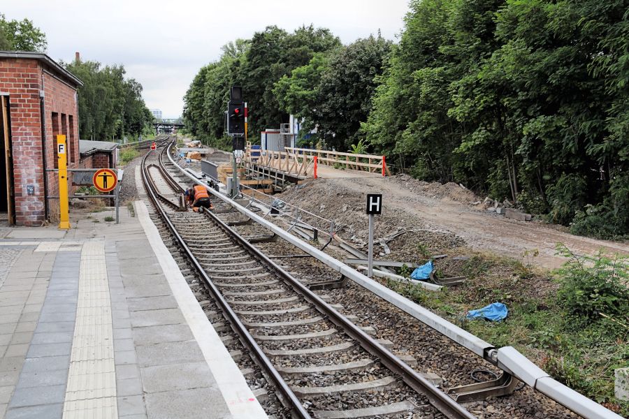 Restarbeiten am Gleis auf der neuen Brücke über dem Verbindungsweg zwischen den beiden Hälften der Großgörschenstraße.