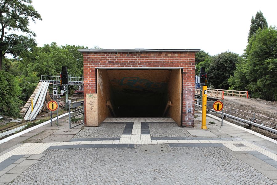 Der trotz Bauarbeiten stets offene Zugang vom Verbindungsweg zwischen den beiden Hälften der Großgörschenstraße (ohne diesen Zugang müssten Fahrgäste und Passanten weite Umwege zurücklegen, um zum Beispiel zum S-Bahnhof Yorckstraße der S-Bahnlinie 2 zu gelangen). |