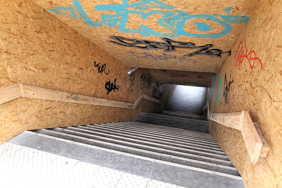 Der Zugang ist im Inneren vollständig mit Holz ausgekleidet, um Fahrgästen Schutz vor eventuellen Beschädigungen des Zugangsbauwerks zu geben.