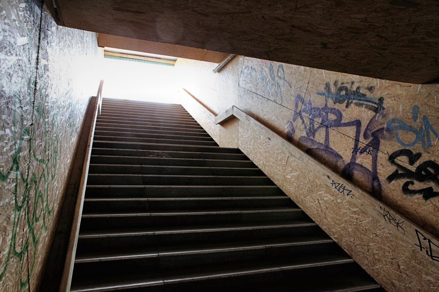 Das Treppenhaus aus Sicht des Verbindungswegs.