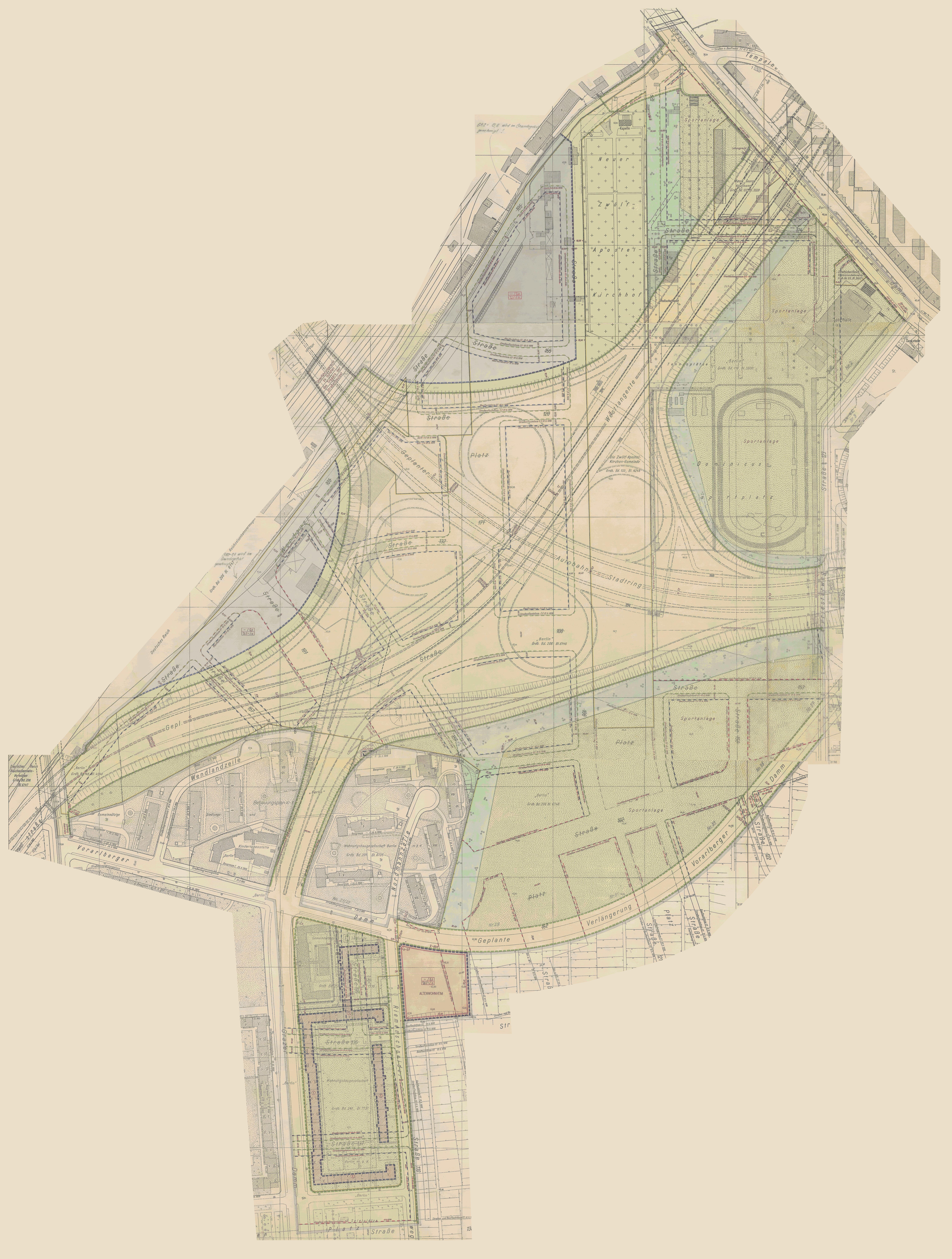 Gesamtkarte (JPG-Datei, Größe 6200 x 8200 Punkte, 8.483.184 Bytes) des Bebauungsplans XI-102 vom 19. August 1964 für das Autobahnkreuz Schöneberg. |