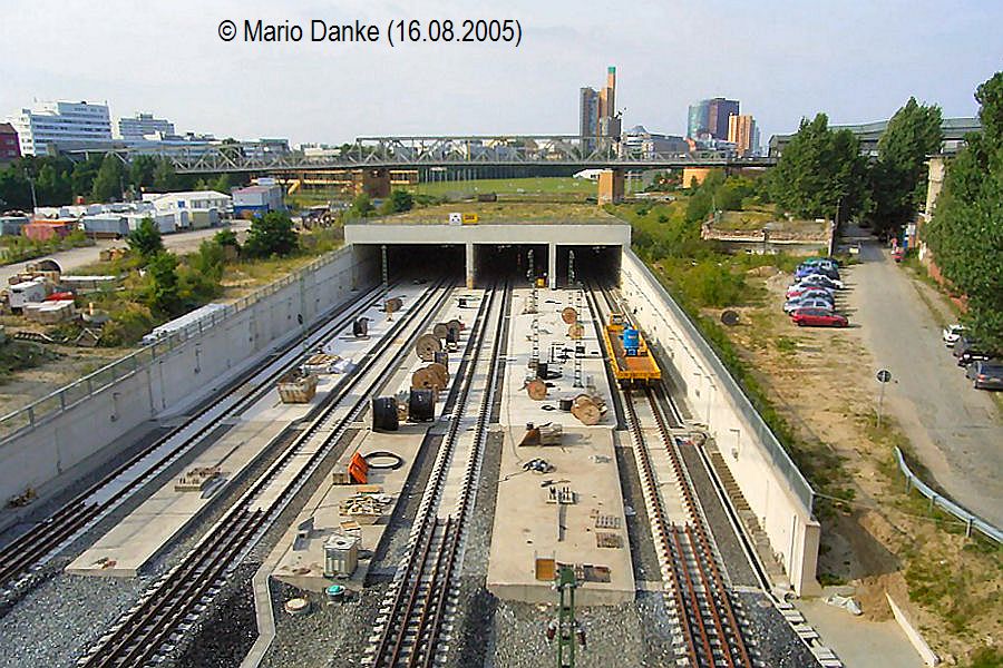 Hier die entgegengesetze Ansicht von der Brücke der U2 Richtung Norden (freundlicherweise von Mario Danke zur Verfügung gestellt). Rechts neben der südlichen Ausfahrt des Fern- und Regionalbahntunnels sind die durch den Tunnelbau abgebrochenen Reste des S-Bahnviadukts der Ring- und Vorortbahnen zu sehen. Ursprünglich war der Tunnelmund etwas weiter südlich geplant (siehe übernächstes Bild), sodass die neue Nord-Süd-S-Bahntrasse unkompliziert nach links über den Tunnel hätte geführt werden können. |
