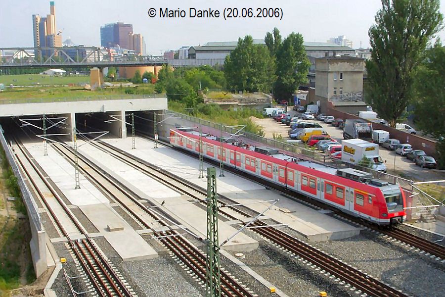 Hier noch einmal ein von einem etwas weiter westlich auf der Brücke der U2 liegenden Standort aufgenommenes Foto von der südlichen Ausfahrt des Fern- und Regionalbahntunnels. Zur Fußballweltmeisterschaft 2006 pendelte eine mit Regionalbahnzügen betriebene Linie S21 zwischen Gesundbrunnen und Südkreuz. Im Bild (freundlicherweise von Mario Danke zur Verfügung gestellt) ist einer dieser Züge zu sehen. |