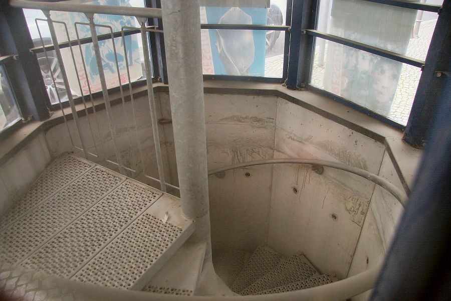 Im Inneren ist eine steile Wendeltreppe zu erkennen.