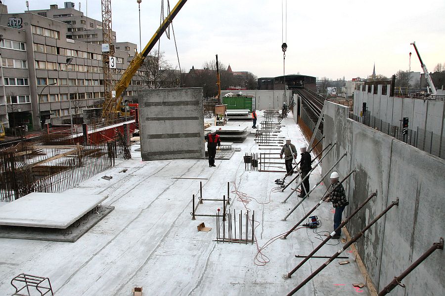 Begibt man sich zur „Bernburger Treppe“, dann kann man von dort die Bauarbeiten an den Gebäuden des „Mendelssohn-Bartholdy-Park“ genannten Projektes beobachten. Hier ein Blick auf die Bauarbeiten an dem Gebäude des dritten Baufeldes an der Köthener Straße. Im Hintergrund kann man den Hochbahnhof Mendelssohn-Bartholdy-Park am Reichpietschufer erkennen, der von den Bauten überbaut werden soll, genauso wie die U-Bahntrasse selbst. |