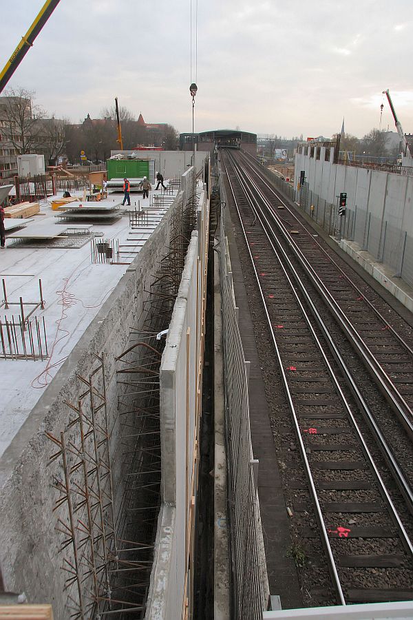 Hier die Sicht auf die Wand zwischen dem Gebäude an der Köthener Straße und der U-Bahntrasse.