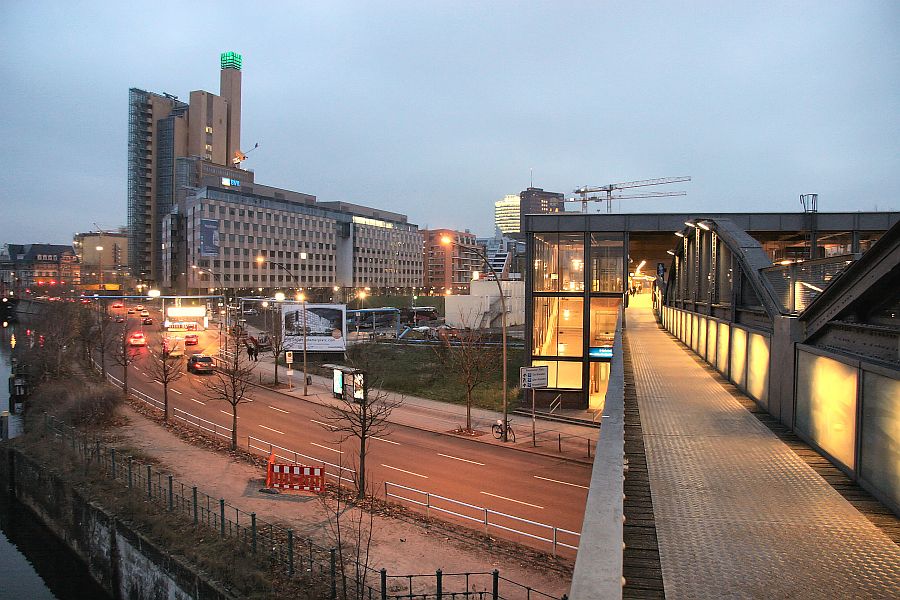 Von der Fußgängerbrücke zwischen dem Hochbahnhof Mendelssohn-Bartholdy-Park und dem debis-Parkhaus aus kann man die S-Bahntrasse einsehen, auch wenn davon kaum Spuren zu erkennen sind. Einziges Zeichen ist die verbreiterte Ufermauer, auf der früher die Brückenpfeiler der S-Bahnstrecke zum Potsdamer Ring- und Vorortbahnhof standen. |
