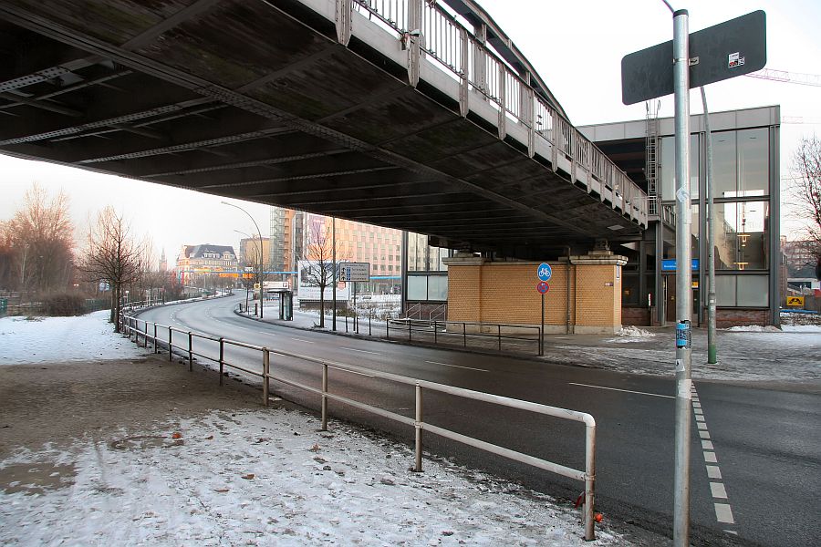 Unter der Brücke fällt das Reichpietschufer ein wenig ab. Unmittelbar nördlich der Brücke befindet sich der U-Bahnhof Mendelssohn-Bartholdy-Park.