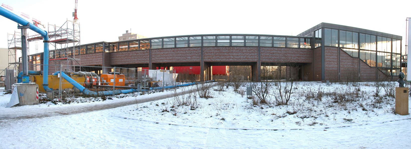 | Hier ein Panorama-Foto mit dem von westlicher Seite aus aufgenommenden U-Bahnhof Mendelssohn-Bartholdy-Park. Ganz rechts im Bild ist die im Jahr 2000 von der Mendelssohn-Gesellschaft aufgestellte Büste von Felix Mendelssohn Bartholdy zu sehen. Das Gelände südlich (rechts) des Bauzauns soll eine öffentliche Grünanlage bleiben bzw. wieder werden. |