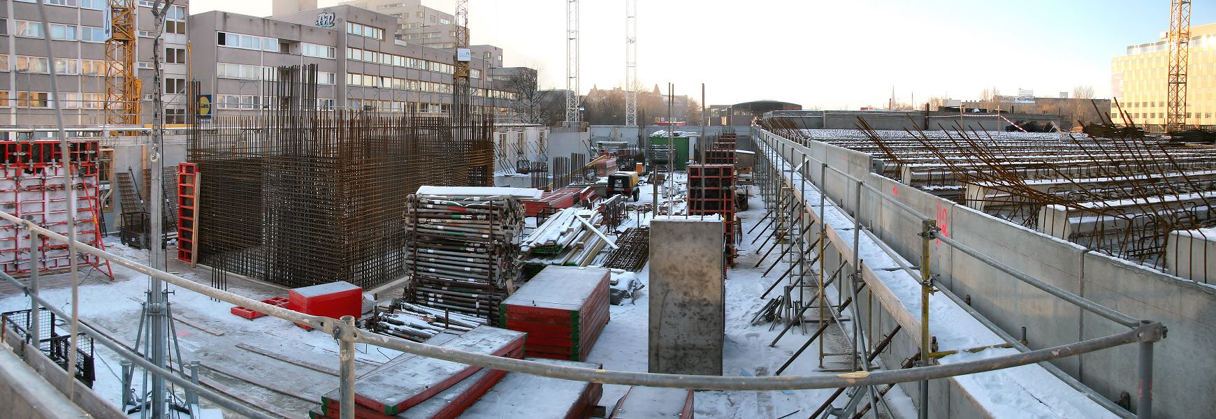 Dieses Panoramafoto zeigt die Baustelle des Miethauses an der Köthener Straße.