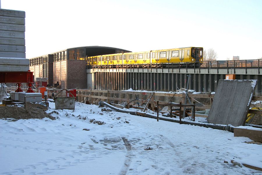 Dieses Foto zeigt den U-Bahnhof Mendelssohn-Bartholdy-Park, einen Zug der Baureihe Hk in Fahrtrichtung Pankow und die Baugrube für das Scandic-Hotel auf der Seite der Köthener Straße.