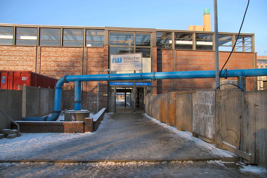 | Mit einem Foto des nördlichen Zugangs zum U-Bahnhof Mendelssohn-Bartholdy-Park endet der Rundgang um den Bahnhof. Durch die im Bild sichtbaren Rohre kann man Flüssigkeiten plätschern hören. Ich nehme an, dass sie der Regulierung des Grundwasserspiegels in der Baugrube dienen. |