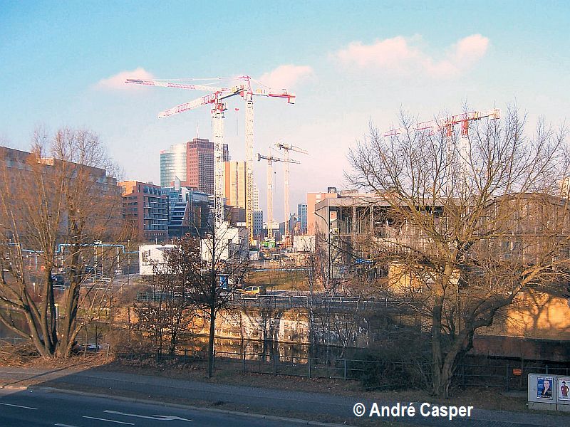 Hier die gleiche Sicht mit etwas weiter aufgezogenen Blickwinkel. Im Vordergrund die Straße Schöneberger Ufer und der Landwehrkanal, rechts die Fußgängerbrücke zwischen U-Bahnhof Mendelssohn-Bartholdy-Park und debis-Parkhaus.