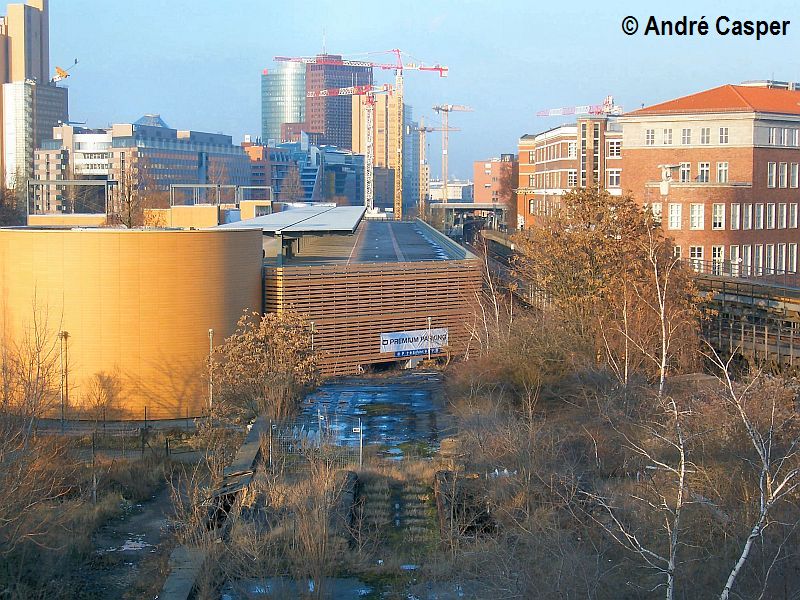 | Blick vom oberen Bahnsteig des U-Bahnhofs Gleisdreieck (Linie 1) nach Norden. Im Hintergrund sind die Kräne der Baustelle, davor das debis-Parkhaus zu sehen. Die östliche (rechte) Seite des Parkhauses steht mit den beiden oberen Geschossen der S-Bahntrasse der S21 im Weg. Im Vordergrund befinden sich noch Reste des alten Viadukts der S-Bahn zum Ring- und Vorortbahnhof am Potsdamer Platz. |