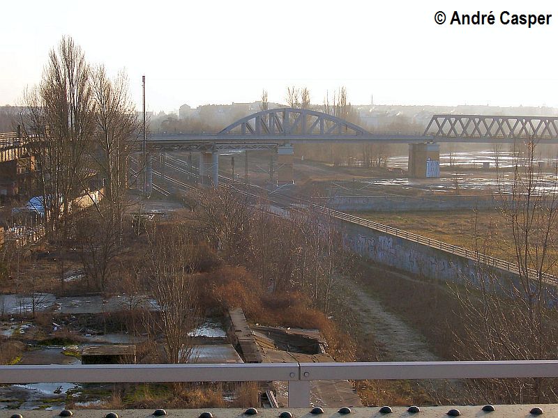 | Abschließend eine Detailaufnahme der sich kreuzenden Bahntrassen südlich des U-Bahnhofs Gleisdreieck. Links das alte S-Bahnviadukt, rechts der Tunnelmund des Nord-Süd-Fernbahntunnels und in der oberen Bildhälfte die Brückenkonstruktionen für die U-Bahnlinie 2. In Bildmitte die im März 2007 fertiggestellte Brücke über den Ferngleisen. |