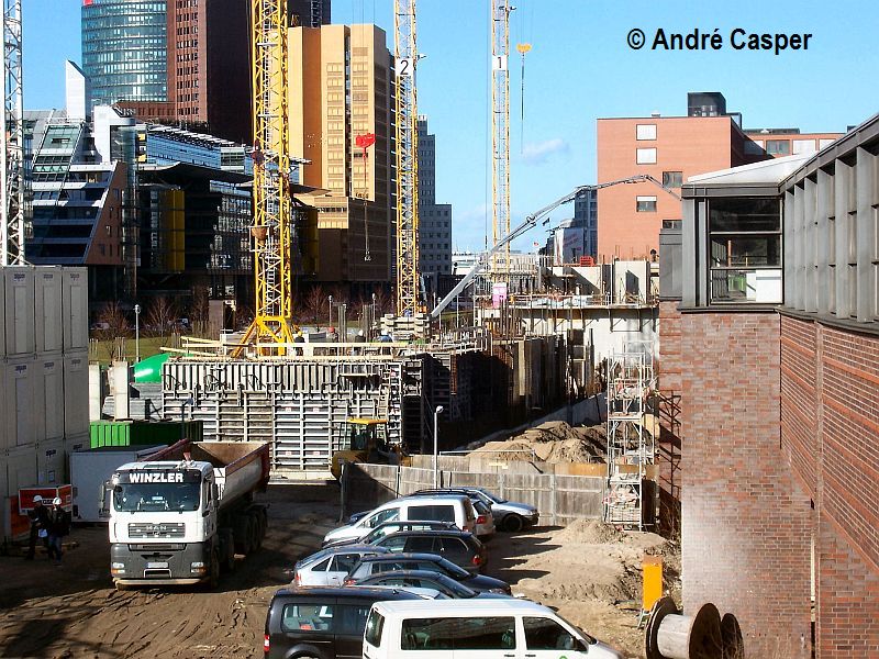 Die Baustelle des Scandic-Hotels auf der westlichen Seite vom Kopfbau des U-Bahnhofs Mendelssohn-Bartholdy-Park aus gesehen.