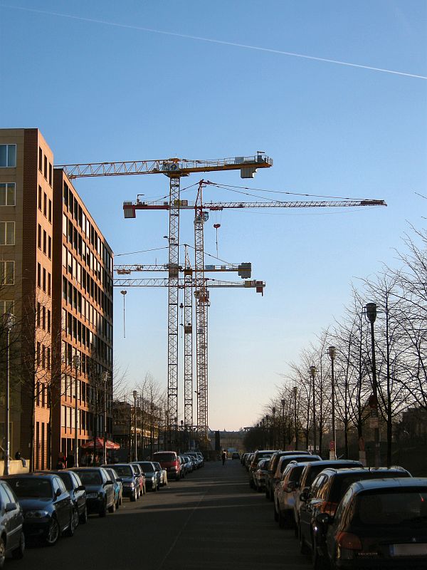 | Am 2. April 2009 bin ich wieder um die Baustelle herumgegangen, um zu schauen, wie weit die Arbeiten vorangekommen sind. Vom Potsdamer Platz kommend, die Gabriele-Tergit-Promenade entlang wandernd, kann man schon von weitem die Kräne der Baustelle sehen. |