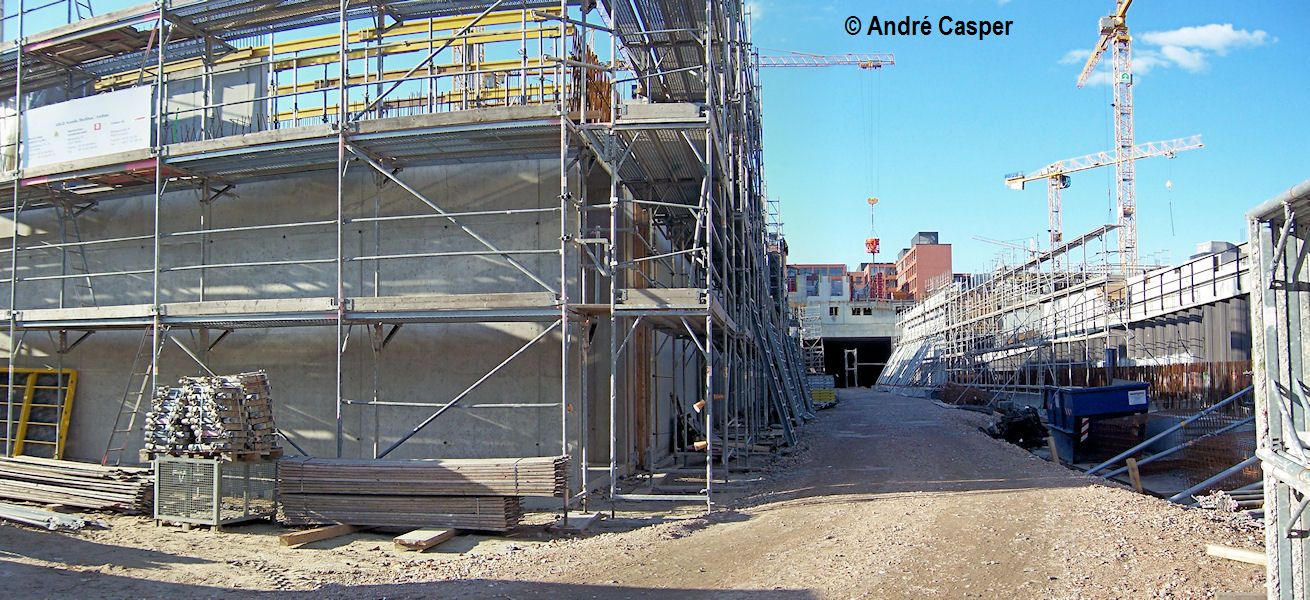 Die westliche Seite des Scandic-Hotels mit der freigehaltenen S-Bahntrasse.