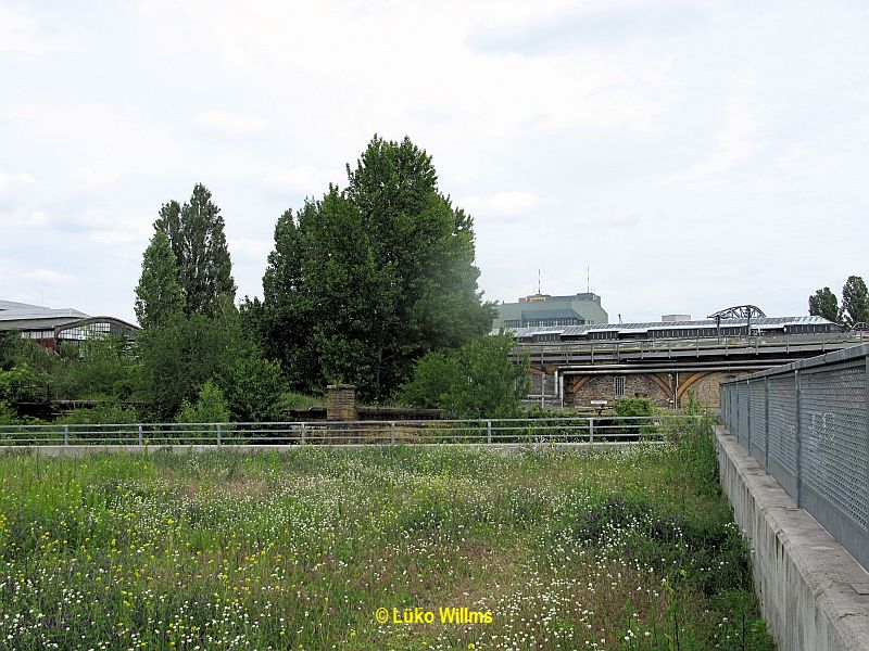 Im Hintergrund kann man die Reste des Viadukts der Ring- und Vorortbahnen erkennen. Der Fotograf befindet sich auf dem südlichen Tunnelmund des Nord-Süd-Fernbahntunnels und fotografiert Richtung Osten. Zu erkennen ist, dass sich die Oberkanten von Tunnelmund und Viaduktresten in gleicher Höhe befinden. Die Trasse der S21 soll hier aber über die Ausfahrt aus dem Nord-Süd-Fernbahntunnel führen. |
