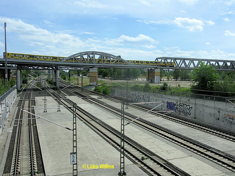 Blick von der Oberkante des Tunnelmunds des Nord-Süd-Fernbahntunnels auf die Ausfahrt Richtung Süden. Hier soll die Trasse der S21 über die Fernbahngleise hinweg und dann unter den Brücken der Hochbahnlinie U2 hindurch geführt werden.