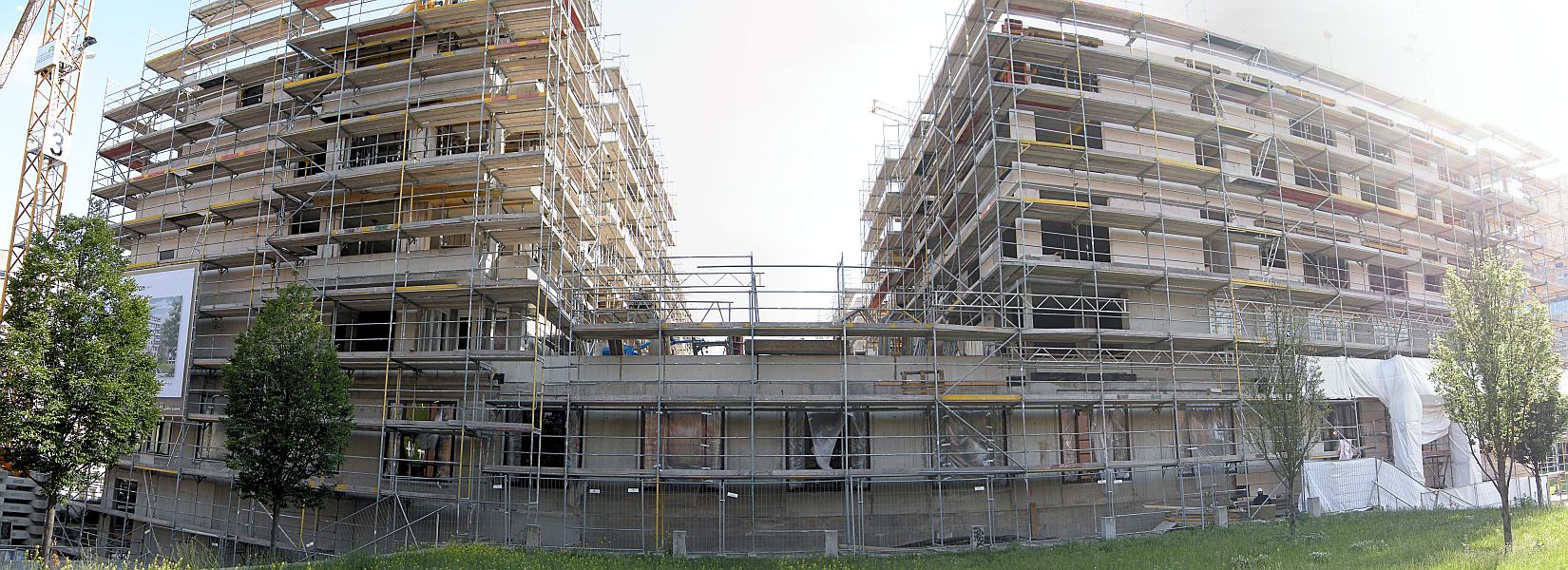 Es besteht wie auf den Bauzeichnungen zu sehen aus mehreren höheren Gebäuden, die bis zum zweiten Obergeschoss verbunden sind. Hier der Blick von der „Bernburger Treppe“ Richtung Süden auf der Trasse der hier unterirdischen U-Bahn.