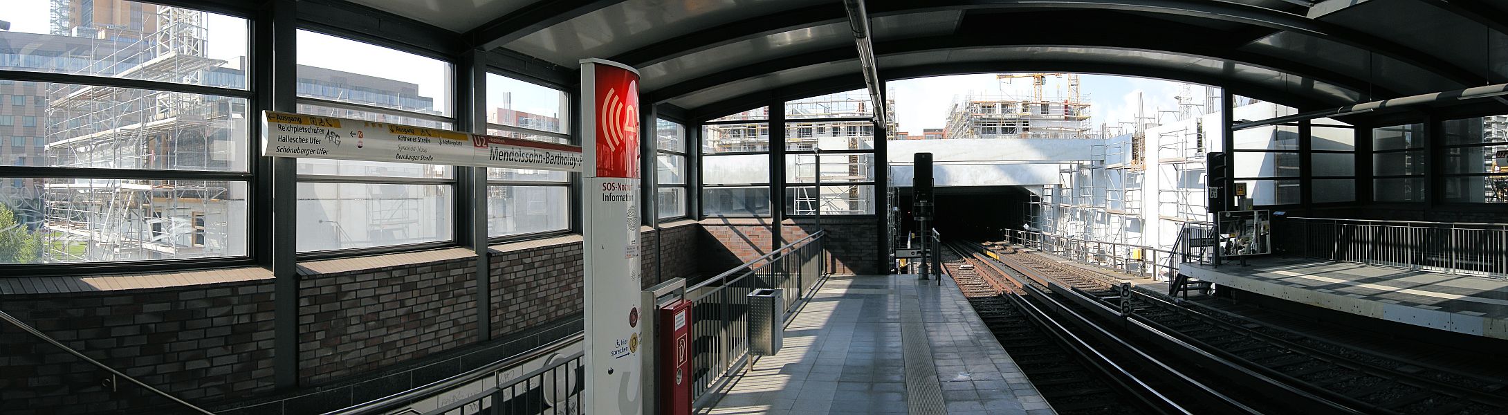 Die Baustelle des Scandic-Hotels aus der Halle des U-Bahnhofs Mendelssohn-Bartholdy-Park, Blickrichtung Norden gesehen.