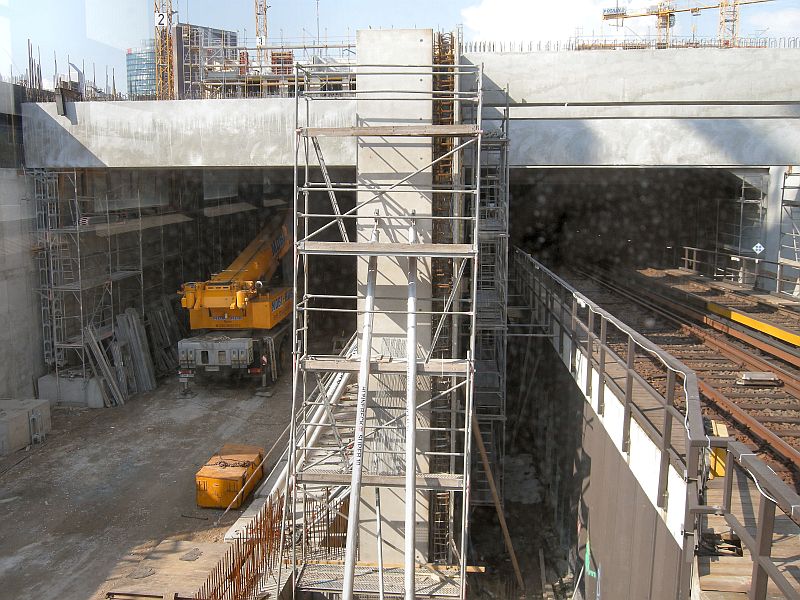 S-Bahntrasse (links) und U-Bahnlinie 2 (rechts) auf einem Blick. Dazwischen die Trennwand, auf der sich auch die oberen Stockwerke des Scandaic-Hotels abstützen werden.