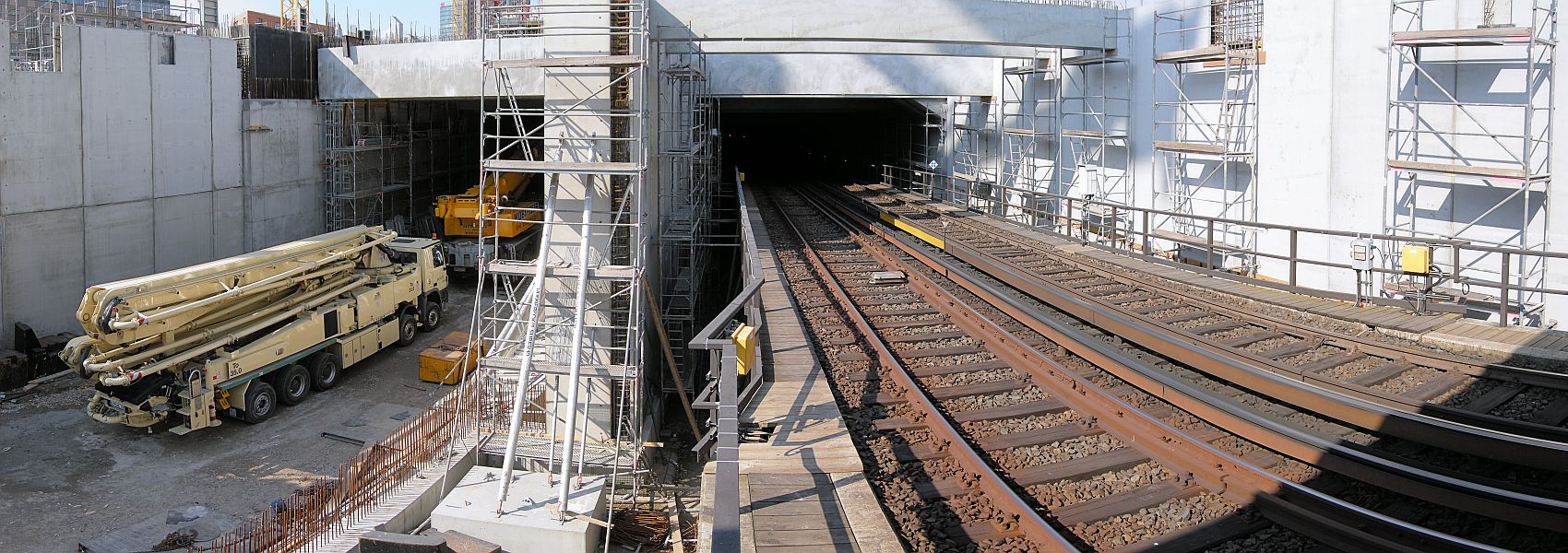 S- und U-Bahntrasse noch einmal, diesmal vom Seitenbahnsteig des U-Bahnhofs Mendelssohn-Bartholdy-Park Richtung Gleisdreieck aus aufgenommen.
