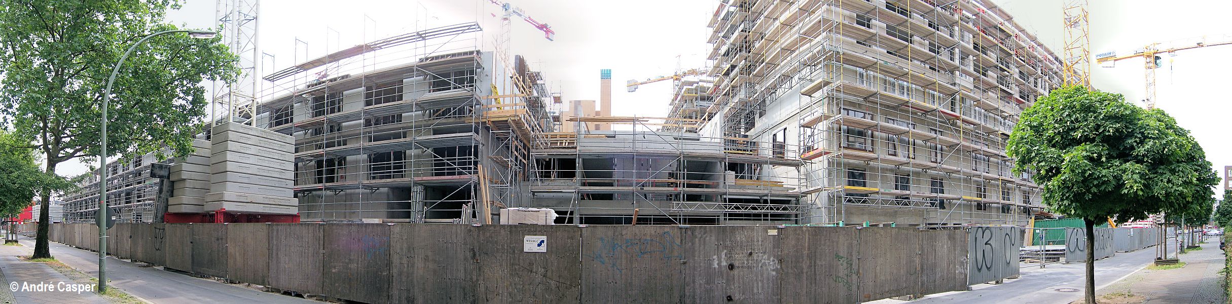Rohbau von Scandic-Hotel (links) und Mietwohnungsgeäude (rechts) von der Köthener Straße aus im Panorama aufgenommen.