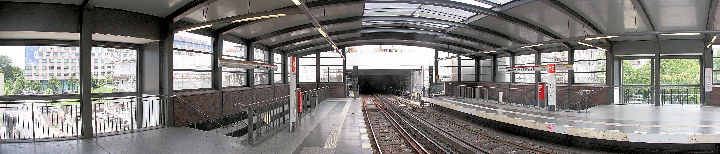 Dieses Panorama zeigt die nördliche Ausfahrt des U-Bahnhofs Mendelssohn-Bartholdy-Park. Der Rohbau des Scandic-Hotels ist bis an den Bahnhof herangebaut worden und wird für die Überbauung des nördlichen Bahnhofgebäudes vorbereitet.