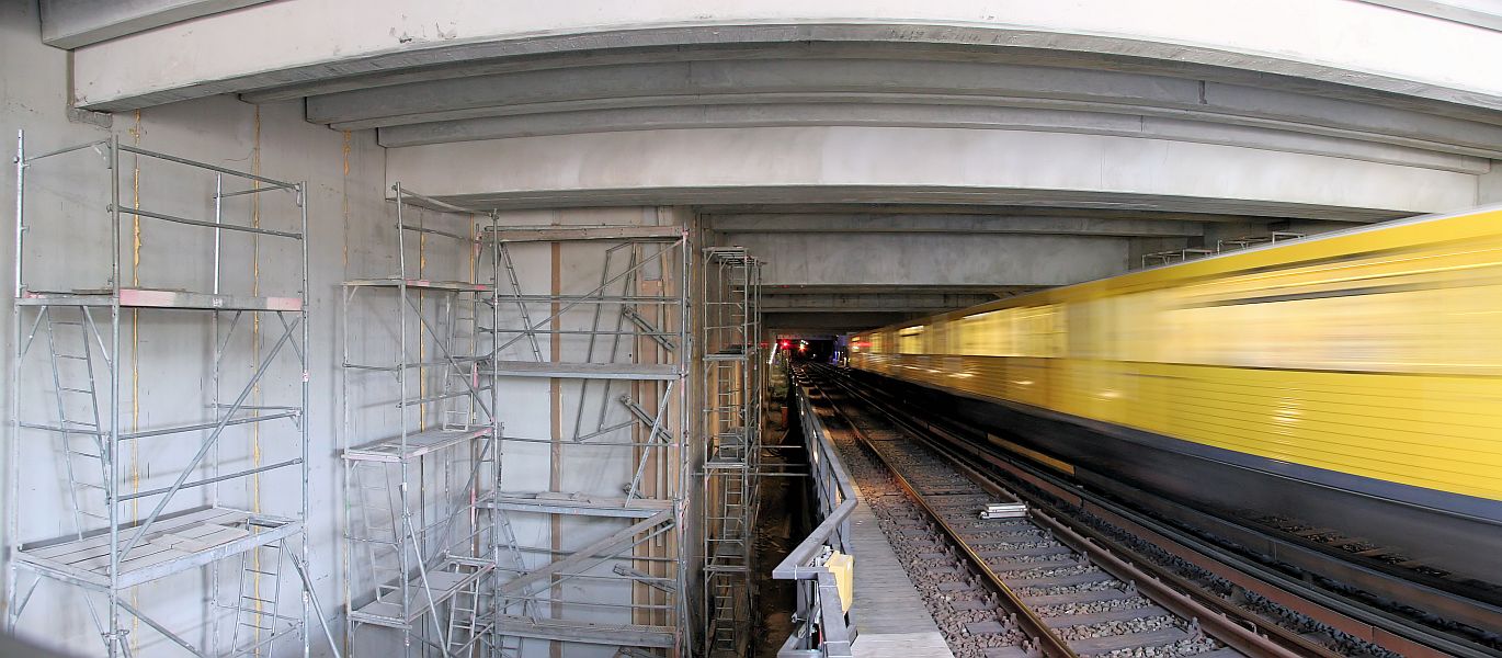 Ein Zug der U-Bahnlinie 2 verlässt den U-Bahnhof Mendelssohn-Bartholdy-Park und fährt Richtung Potsdamer Platz in den durch die Rohbauten gebildeten Tunnel.