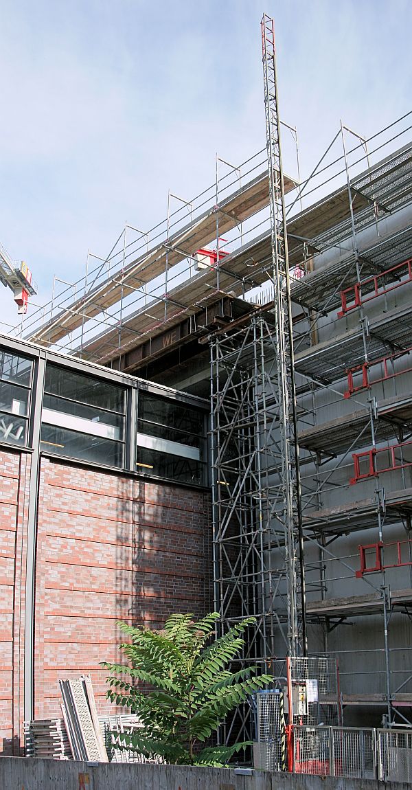 Das Gebäude des U-Bahnhofs Mendelssohn-Bartholdy-Park wirkt (noch) wie ein Fremdkörper im Rohbau des Scandic-Hotels.