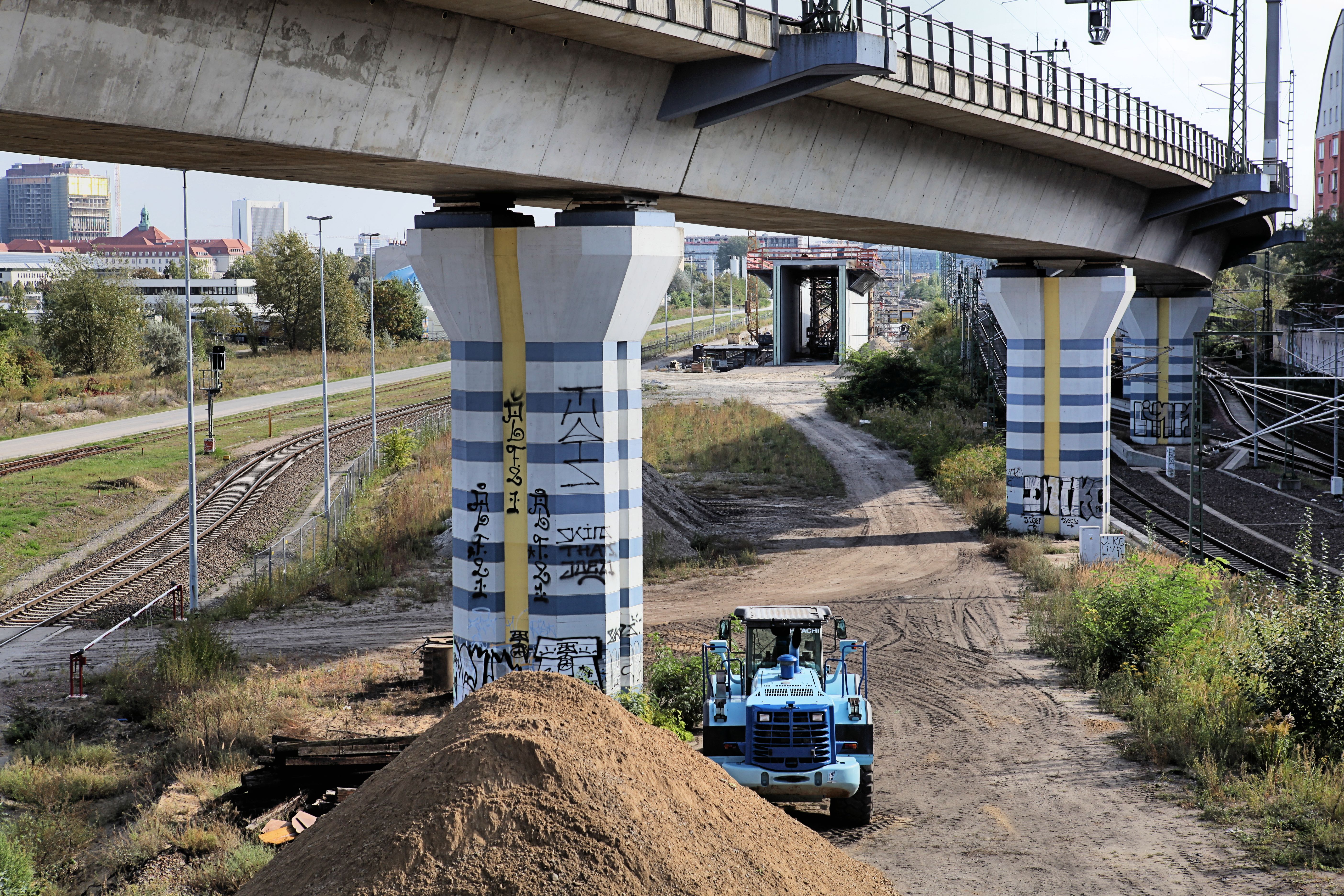 Sie führt unter Perleberger Brücke und Overfly hindurch, rechts und links am Rampenbauwerk vorbei zum Tunnelmund an der Minna-Cauer-Straße