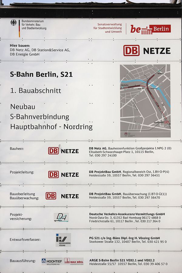 An der Fennstraße steht, wenige Meter westlich der Tegeler Straße, dieses Bauschild für den Bau des ersten Abschnitts der S21. Die Darstellungen auf der Karte sind ein wenig irreführend, weil die Ausfädelungsbauwerke mitnichten Brücken-, sondern Tunnelbauwerke sind. |