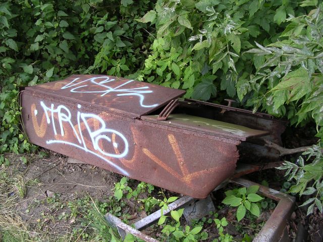 Kurz vor Erreichen der Spree ist noch ein umgestürzter Schaltschrank und ein darunterliegender Rest eines Signalmastes zu sehen.