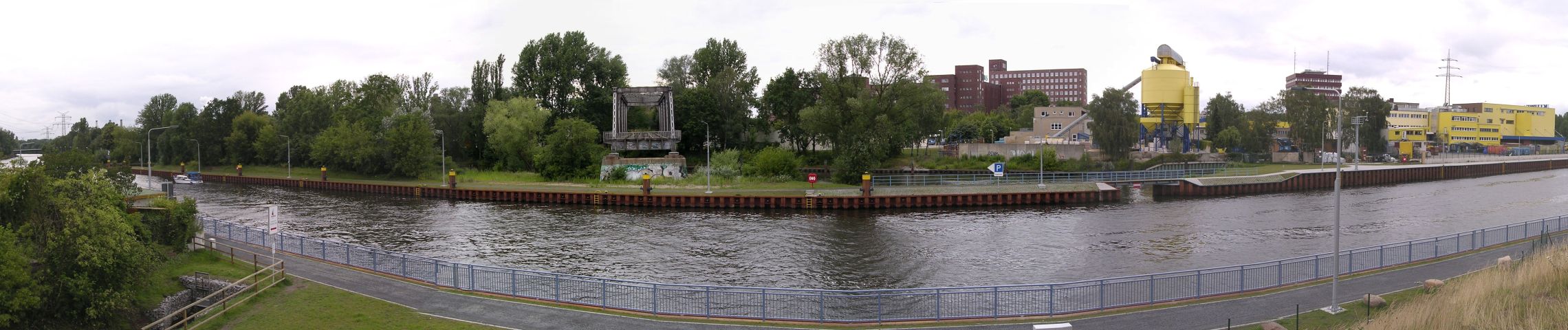 | Auf einer Karte zu dieser Stelle liegt die Spree noch in ihrem alten Flussbett, das auf diesem Foto hinter der neuen Spundwand zu erkennen ist und zu dem noch eine Öffnung (im Bild rechts) existiert. Die Spree wurde hier schon 1928/29 auf Anweisung der Wasserstraßenverwaltung auf zwei Überbauten überquert, da schon damals eine neue Schleuse und die Begradigung geplant war. |