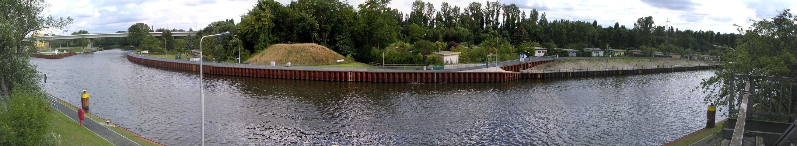 Von der anderen Seite des Ufers bzw. vom Mittelpfeiler der Spreebrücke aus hat man diese Sicht. Auf der gegenüberliegenden Seite kann man den Rest des Bahndammes der Siemensbahn erkennen.