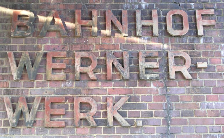 Der Stationsname des S-Bahnhofes Wernerwerk in Großaufnahme, die Buchstaben verwittern zusehens.