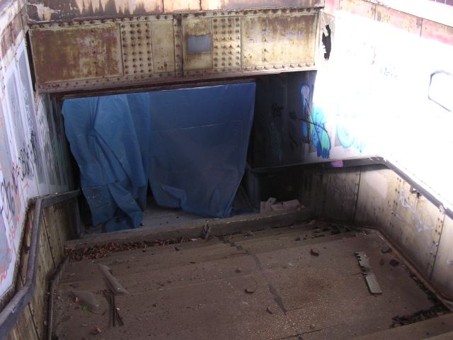 | Ein Blick auf die andere südliche Zugangstreppe. Hinter der blauen Plastikfolie sind Holzeinbauten und eine Sicherheitstür. Es sieht so aus, als wenn jemand das Treppenhaus mit Blechplatten verkleidet hat, um in der Tischlerei mit Farbe hantieren zu können. |