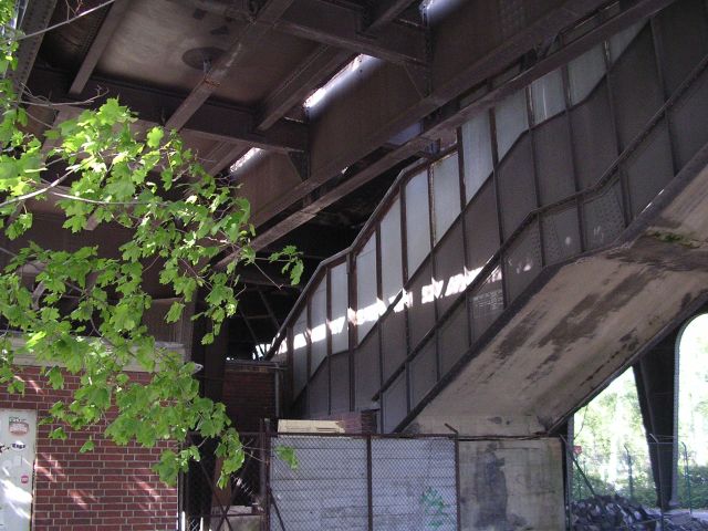 Die gleiche Treppe noch einmal von unten, die Verkleidung mit Blechplatten ist deutlich zu sehen.