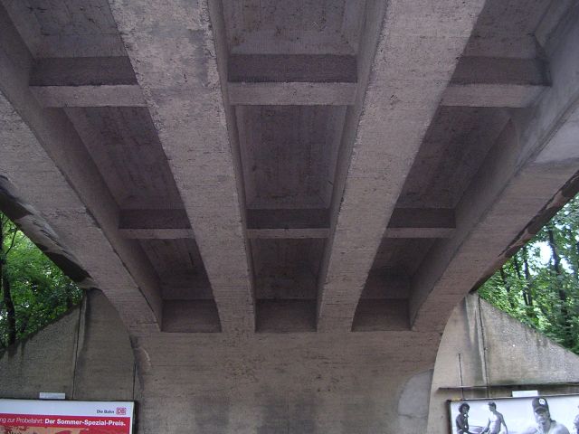 Und hier ein Blick unter die Brücke über dem Jungfernheideweg. Die Brücke ist seit ihrer Erbauung vor 75 Jahren an mehreren Stellen erkennbar ausgebessert worden.