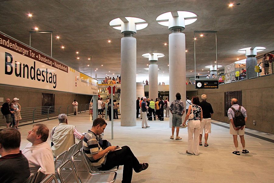 | Hier der Blick vom Bahnsteig des U-Bahnhofs Bundestag auf das nördliche Zwischengeschoss. Durch die Gallerien und die Tageslicht hereinlassenden Öffnungen in der Decke macht die Halle einen luftigen und hellen Eindruck. Rechts ist die Bahnsteigkante zum Gleis 1 zu sehen, auf dem der Pendelverkehr der U-Bahnlinie 55 abgewickelt wird. Links ist das Absperrgitter an der Bahnsteigkante zum Gleis 2 zu erkennen. |